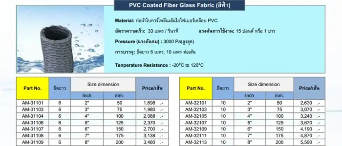 – ท่อผ้าใบสีฟ้า: ผลิตจากผ้าใบเคลือบ PVC หนา เสริมด้วยโครงลวดสปริงภายใน เพื่อเพิ่มความทนทานและความยืดหยุ่น เหมาะสำหรับการใช้งานในระบบระบายอากาศทั่วไป เช่น การระบายลมร้อน-เย็น และการระบายฝุ่นควัน