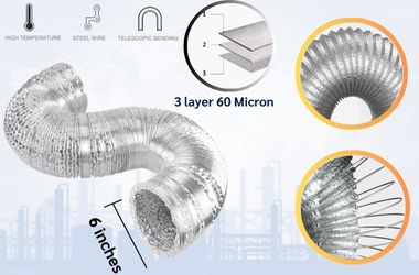 ท่อมีเส้นผ่านศูนย์กลาง 6 นิ้ว (ประมาณ 150 มม.) และความยาวต่อม้วน 10 เมตร สามารถตัดแบ่งตามความต้องการติดตั้งในแต่ละพื้นที่ได้อย่างสะดวก ความยาวที่มากช่วยลดจำนวนรอยต่อและข้อต่อ ทำให้ระบบระบายอากาศมีประสิทธิภาพสูงขึ้นและลดโอกาสเกิดการรั่วซึม โครงสร้างและวัสดุ ท่อชนิดนี้ทำจาก ฟอยล์อลูมิเนียม 3 ชั้น ความหนารวม 60 ไมครอน พร้อมเสริมด้วยโครงลวดสปริงภายใน ทำให้ท่อมีความแข็งแรงและคงรูปได้ดี แม้จะถูกดัดโค้งหรือยืดหดหลายครั้ง