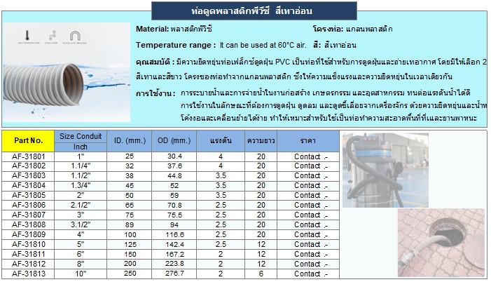 อธิบายสรุป ท่อเฟล็กซ์ PVC | ท่อดูดฝุ่นสีเทา เป็นท่อพลาสติกที่ออกแบบมาเพื่อใช้งานในระบบระบายอากาศและดูดฝุ่นในอุตสาหกรรมต่างๆ ด้วยความยืดหยุ่นสูง ทำให้สามารถติดตั้งในพื้นที่ที่มีข้อจำกัดได้ง่าย ท่อมีความทนทานต่อการใช้งาน และสามารถรองรับการดูดฝุ่นหรืออนุภาคเล็กๆ ได้อย่างมีประสิทธิภาพ ตัวท่อผลิตจาก PVC ซึ่งมีคุณสมบัติทนทานต่อการเสียดสีและแรงดันได้ดี เหมาะสำหรับการใช้งานที่ต้องการการเคลื่อนไหวหรือการดัดโค้ง ท่อชนิดนี้ยังเหมาะสำหรับการใช้ในงานดูดลมหรือการระบายอากาศต่างๆ ในโรงงาน เครื่องจักร หรือการทำความสะอาดอุปกรณ์ต่างๆ