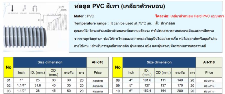 อธิบายสรุป ท่อดูดฝุ่นสีเทา PVC เกลียวพลาสติก เป็นท่อที่ทำจากวัสดุ PVC มีความยืดหยุ่นสูงและเสริมความแข็งแรงด้วยเกลียวพลาสติกภายใน ท่อชนิดนี้ถูกออกแบบมาเพื่อใช้ในการดูดฝุ่น ดูดอากาศ ดูดขี้เลื่อยจากเครื่องจักรต่างๆ หรือใช้ในการระบายอากาศ ฝุ่นละออง ควัน และเศษผงในโรงงานอุตสาหกรรม อาคารบ้านเรือน หรือสถานที่ที่มีการปล่อยฝุ่นและควัน ท่อชนิดนี้มีคุณสมบัติที่ทนทานต่อการขัดสี ทนแรงดึงและแรงกด มีความยืดหยุ่นสูง จึงสามารถติดตั้งในพื้นที่แคบหรือปรับรูปทรงได้ตามต้องการ การใช้งานง่ายและบำรุงรักษาต่ำ นอกจากนี้ยังทนทานต่อสารเคมีบางชนิดและอุณหภูมิที่หลากหลาย