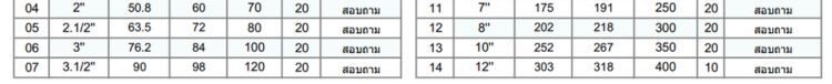 ขนาด (นิ้ว) (Inch) เส้นผ่านศูนย์กลางภายใน (มม.) (ID. (mm.)) เส้นผ่านศูนย์กลางภายนอก (มม.) (OD (mm.)) แรงดัน ความยาว (เมตร)