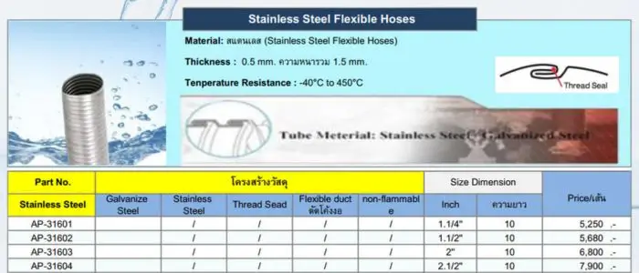 ท่อเฟล็กซ์สแตนเลส (Stainless Flex Duct 304) เป็นท่อลมระบายอากาศที่ผลิตจากสแตนเลสเกรด 304 ซึ่งมีคุณสมบัติพิเศษในการทนทานต่อการกัดกร่อนจากสารเคมีและความร้อนสูงถึง 450 องศาเซลเซียส. ท่อลมสแตนเลสเหมาะสำหรับการใช้งานในระบบระบายลมร้อน, ระบบไอเสีย, หรือการระบายอากาศในสภาพแวดล้อมที่มีอุณหภูมิสูง เช่น เครื่องจักรหรือโรงงานอุตสาหกรรม โครงสร้างเกลียว Interlock ช่วยเพิ่มความทนทานต่อแรงดันและการใช้งานในสภาพแวดล้อมที่มีความร้อนและแรงดันสูง