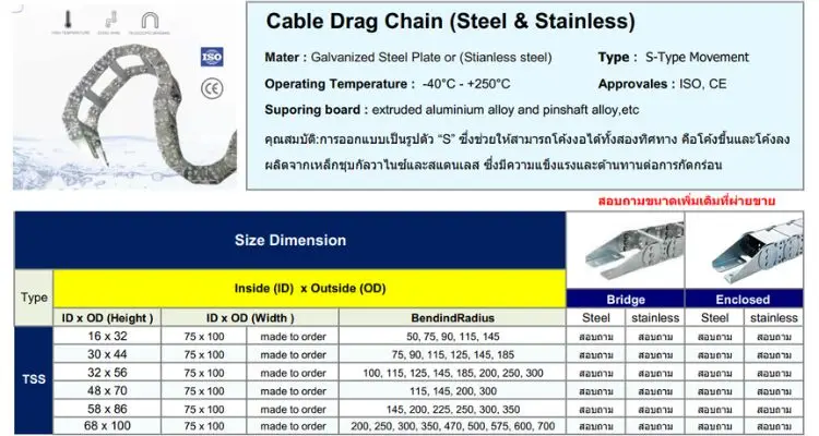 คุณสมบัติด้วยการเลือกใช้วัสดุที่ทนทานและการออกแบบที่ป้องกันการบิดงอ Steel Cable Drag Chain รุ่น S-Type ช่วยยืดอายุการใช้งานของสายไฟและท่อในระบบการผลิต โครงสร้างที่มี โครงสร้างจากเหล็กช่วยให้การเชื่อมต่อระหว่างข้อต่อมีความแข็งแรง และสามารถเคลื่อนไหวได้อย่างลื่นไหลโดยไม่ทำให้เกิดการเสียดสีภายในราง ซึ่งเป็นหนึ่งในสาเหตุหลักที่ทำให้สายไฟและท่อเกิดการเสียหาย การใช้วัสดุที่มีคุณภาพสูงยังทำให้การบำรุงรักษาเป็นไปอย่างง่ายดาย ลดการหยุดซ่อมบำรุง และช่วยเพิ่มประสิทธิภาพในการทำงานของอุปกรณ์ทั้งหมดในระบบ
