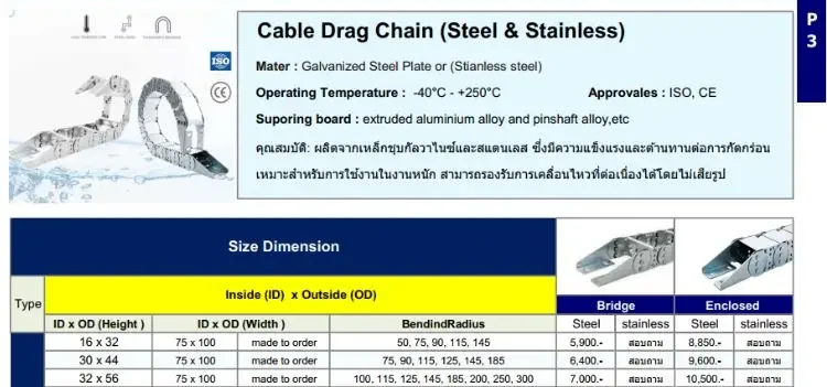 รางกระดูกงู Cable Drag Chain คือ รางที่ใช้ในการจัดระเบียบและป้องกันสายเคเบิลหรือท่อ ซึ่งออกแบบมาเพื่อเพิ่มความทนทานในสภาพแวดล้อมที่มีความร้อนสูงและสารเคมีต่าง ๆ โดยช่วยป้องกันการเสียดสี การพันกัน และการเสียหายของสายไฟ ช่วยยืดอายุการใช้งานของสายไฟหรือท่อในระยะยาว มีความเหมาะสมสำหรับการใช้งานในงานอุตสาหกรรมที่ต้องการความทนทานสูง เช่น โรงงาน, เครื่องจักร, และระบบไฟฟ้าที่ต้องการความปลอดภัยและประสิทธิภาพในการเคลื่อนที่.